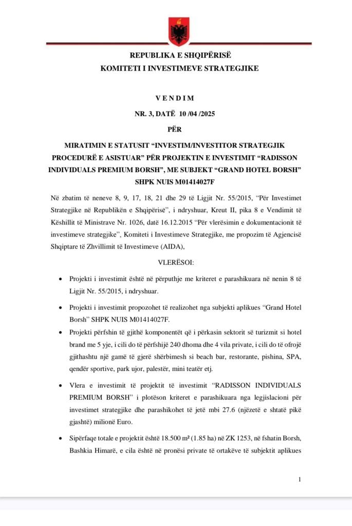 Në këtë panoramë të errët financiare del në pah emri i Shaban Xhabrahimit, konsull nderi i Bangladeshit në Shqipëri, i cili është shpallur “investitor strategjik” për ndërtimin e një resorti luksoz në Borsh. Projekti i miratuar nga Komiteti i Investimeve Strategjike më 10 prill 2025, nën drejtimin e kryeministrit Edi Rama, parashikon ngritjen e “Radisson Individuals Premium Borsh”, një kompleks pesë yje me 240 dhoma dhe vila private.