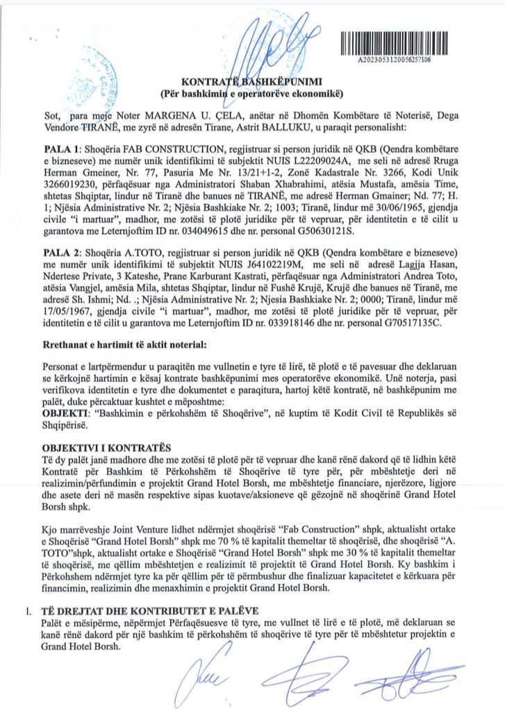 Kompania që do të zbatojë projektin, “Grand Hotel Borsh”, është themeluar në vitin 2020. Aksionet e saj ndahen mes “Fab Construction”, me 70%, dhe “A.Toto”, me 30%. Të dyja kompanitë janë nën kontrollin e personave që kanë lidhje të drejtpërdrejta me Xhabrahimin, përfshirë Fredi dhe Andrea Toto.
