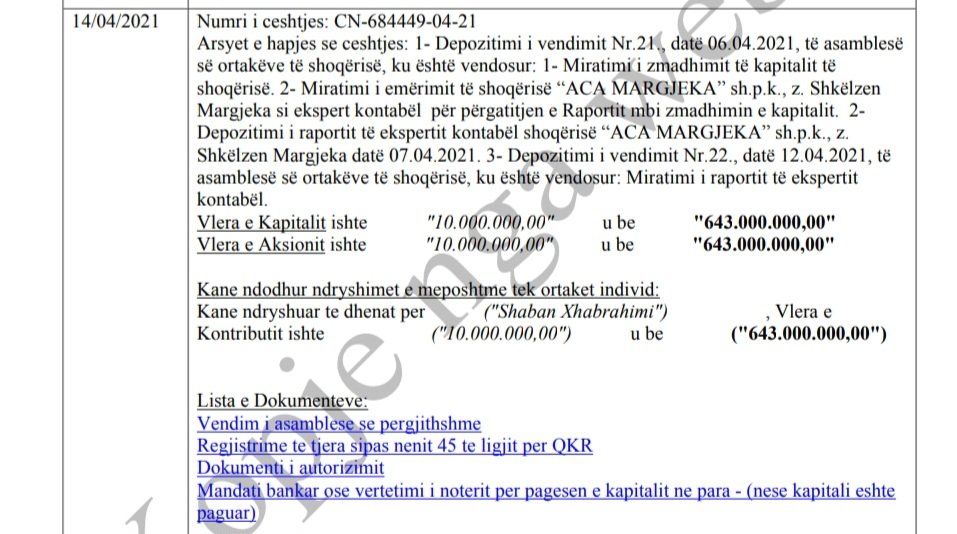 Në qendër të dyshimeve mbetet burimi i parave që financojnë resortin. “Fab Construction” u themelua në vitin 2012, me një kapital fillestar prej vetëm 100 mijë euro. Por në vitin 2021, Xhabrahimi e rriti kapitalin në mënyrë të papritur në 6.4 milionë euro, pa asnjë shpjegim të qartë për origjinën e fondeve.
