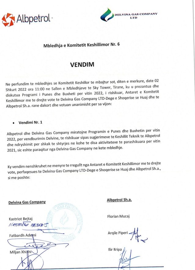 Komiteti përbëhej nga përfaqësues të “Albpetrolit”, përfshirë edhe Drejtorin Ekzekutiv Florian Muçaj, dhe përfaqësues të kompanisë koncesionare. Në këtë plan parashikohej ndërtimi, prokurimi dhe instalimi i impiantit për pastrimin e gazit nga H2S dhe përgatitja e tij për tregtim.