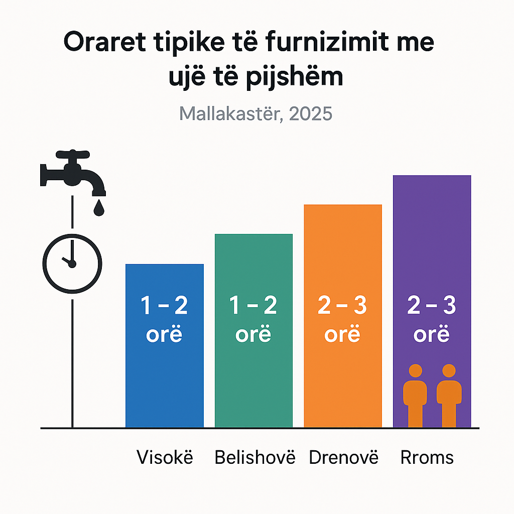Furnizimi me ujë mbetet problem themelor. Në shumë fshatra, përfshi Visokën, Belishovën, Drenovën, Rromsin dhe Lapulecin, sipas mediave qëndrore oraret janë të paqëndrueshme dhe presioni i ulët, ndërsa rrjeti ka humbje të larta dhe avari të shpeshta. Situata e përgjithshme në sektorin e ujësjellës-kanalizimeve është larg standardit, duke e lënë Mallakastrën prapa nevojave minimale të komunitetit.