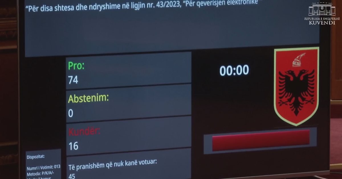 Me 74 vota pro, 16 kundër dhe asnjë abstenim, Kuvendi miratoi projektligjin “Për disa shtesa dhe ndryshime në ligjin nr. 43/2023 ‘Për qeverisjen elektronike’”.