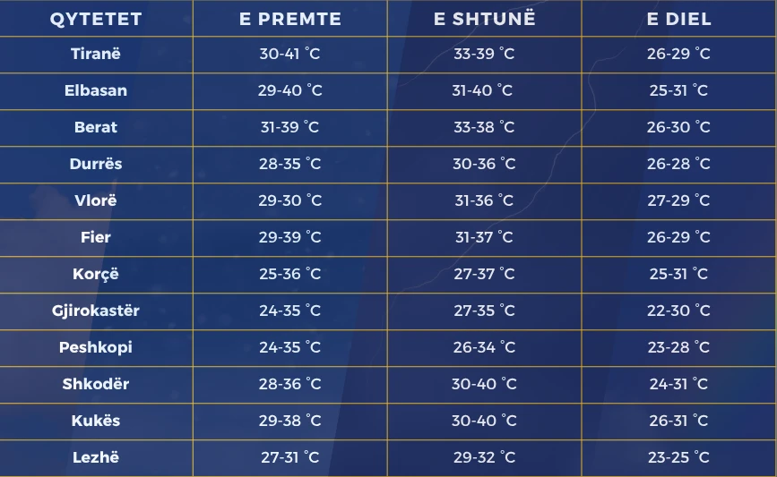 Temperaturat e mëngjesit do të jenë të përshtatshme, por gjatë mesditës dhe orëve të pasdites priten vlera të larta që mund të arrijnë deri në nivele përvëluese. Rekomandohet kujdes maksimal ndaj ekspozimit në diell.