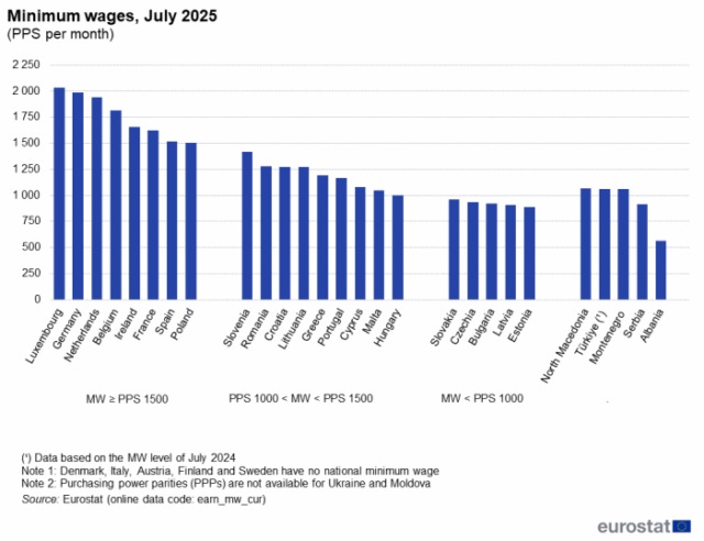 Megjithatë, të dhënat zyrtare të Eurostat për korrikun 2025 tregojnë një panoramë krejt tjetër. Paga minimale në Shqipëri është rreth 408 euro, ose 45,540 lekë. Kjo e pozicionon vendin në fund të listës në rajon dhe në Evropë, si në vlerë nominale, ashtu edhe në raport me fuqinë reale të blerjes, raporton faktoje.al.