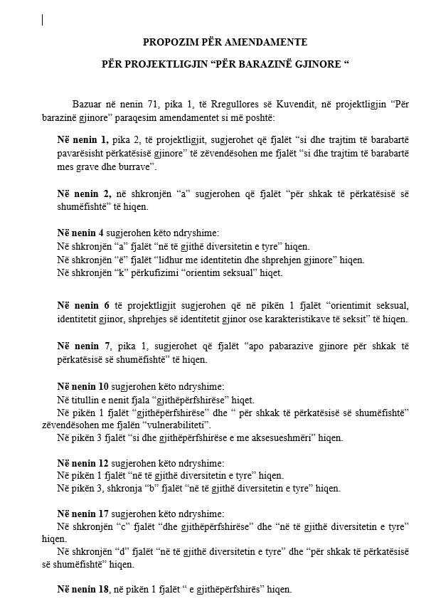 PS ka dorëzuar në Kuvend amendamentet për projektligjin “Për Barazinë Gjinore”, duke e përcaktuar qartë se ligji do të njohë vetëm dy kategori gjinore: burrë dhe grua. Kjo lëvizje vjen pas një periudhe polemikash të forta mbi identitetin gjinor dhe të drejtën e vetëpërcaktimit.