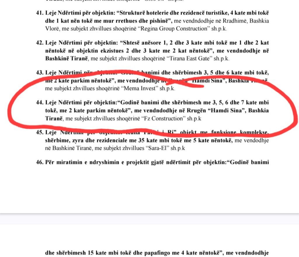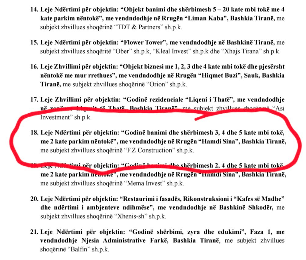 Këshilli Kombëtar i Territorit dhe Ujit (KKTU) zhvilloi më 26 mars 2025 një mbledhje ku miratoi 59 leje ndërtimi, kryesisht për kulla dhe resorte luksoze. Mes tyre, u aprovua edhe një leje për një godinë banimi dhe shërbimesh deri në shtatë kate mbi tokë, me dy kate parkim nëntokë, në Rrugën “Hamdi Sina” të Tiranës. Projekti do të realizohet nga kompania “Fz Construction” sh.p.k., aktive në zonën e Liqenit të Thatë.