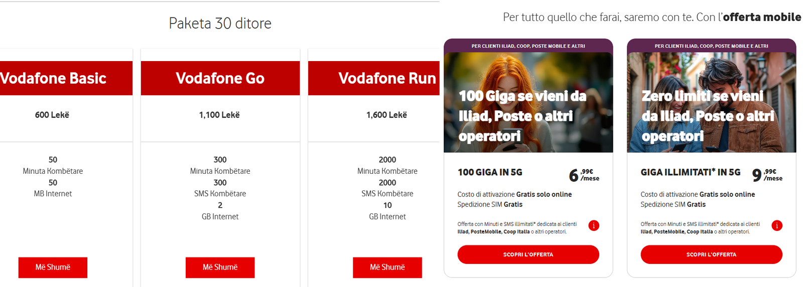 Në Shqipëri, paketa më popullore Vodafone Go kushton 1,100 lekë për 30 ditë, duke përfshirë vetëm 300 minuta dhe 2 GB internet. Në krahasim, në Itali një paketë me 100 GB në 5G kushton vetëm 6.99 euro në muaj dhe përfshin minuta dhe mesazhe të pakufizuara, duke ofruar një vlerë shumë më të mirë për konsumatorin.